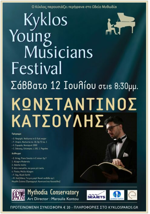 Το Φεστιβάλ άνοιξε στις 12 Ιουλίου 2025, στο Ωδείο Μυθωδία στην Παροικιά, με ένα ρεσιτάλ πιάνου από τον ανερχόμενο σολίστα Κωνσταντίνο Κατσούλη, ο οποίος ερμήνευσε έργα των [προσθέστε συνθέτες/έργα]. Απόφοιτος του Νέου Ωδείου Θεσσαλονίκης και τελειόφοιτος του Αριστοτελείου Πανεπιστημίου και του Κρατικού Ωδείου Θεσσαλονίκης, ο κ. Κατσούλης έχει διακριθεί σε πανελλήνιους διαγωνισμούς και έχει εμφανιστεί ως σολίστ με σημαντικές ορχήστρες.